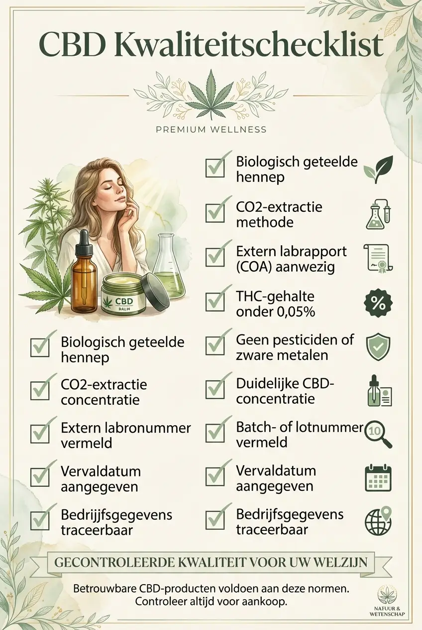 CBD olie kwaliteit herken je aan: third-party labresultaten, biologische certificering, CO2-extractie, en volledige ingredientenlijst. Kies producten met minder dan 0,2% THC voor legale zekerheid.